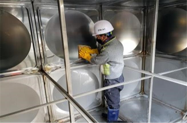 | ▲화순군이 이달 18일부터 깨끗한 생활용수 공급을 위해 11개 읍면, 소규모 수도시설 배수지 115곳을 청소한다. 사진은 소규모 수도시설 물탱크를 청소하는 모습.(사진=화순군) |