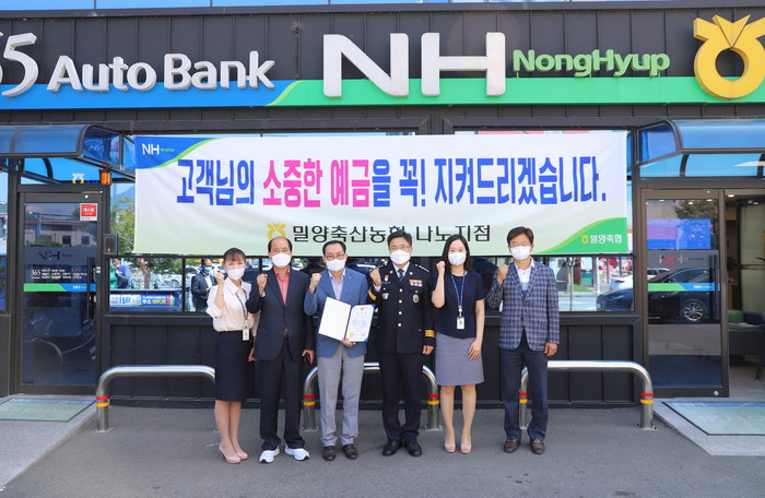 [세계로컬타임즈 김점태 기자] 밀양축산농협 나노지점은 지난 3일, 서억만 지점장을 비롯한 직원들의 신속하고 적극적인 대처로 사전에 보이스피싱 피해를 막아 밀양경찰서로부터 감사장을 받았다고 6일 밝혔다.