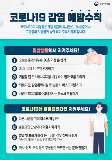 또 증상 발생 시 가까운 의료기관을 찾아 진료를 받고, 65세 이상 또는 기저질환이 있는 고위험군의 경우에는 먹는 치료제 처방이 권장된다.
