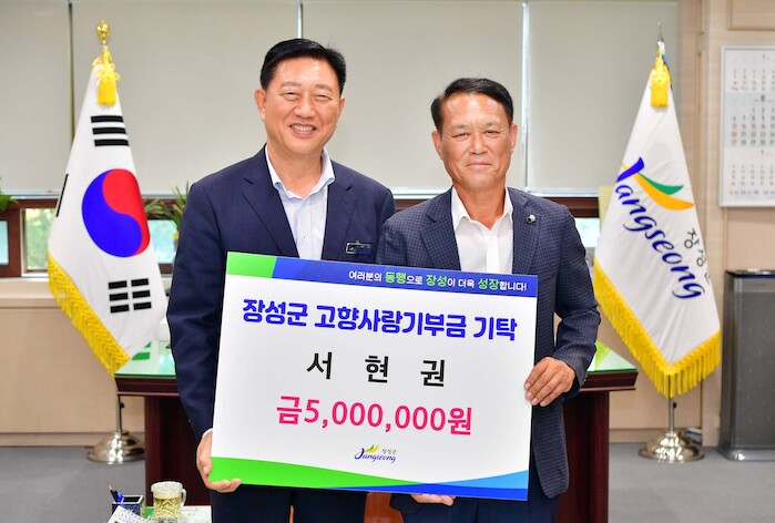 [세계로컬타임즈 이남규 기자] 7일 출향 기업인 서현권 대표가 장성군에 고향사랑기부금 개인 기부금 최고 한도인 500만원을 기부했다.