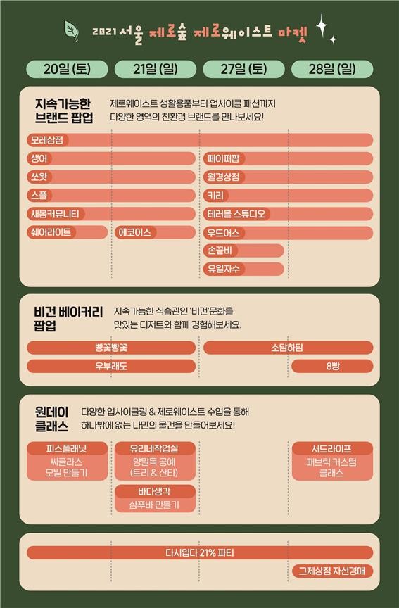 이에 덧붙여 다양한 제로웨이스트 매장을 한자리에서 만나볼 수 있도록 마련된 ‘서울 제로숲 제로웨이스트 마켓’은 오는 20·21일, 27·28일 4일간 오전 10시~오후 6시에 열린다.