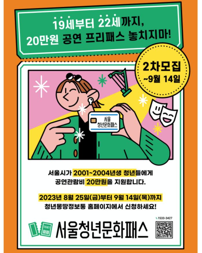 [세계로컬타임즈 이효진 기자] 서울시는 서울거주 청년들에게 공연 관람에 사용할 수 있는 연 20만 원의 문화이용권을 지원하는 ‘서울청년문화패스’의 하반기 신청 접수를 받는다.