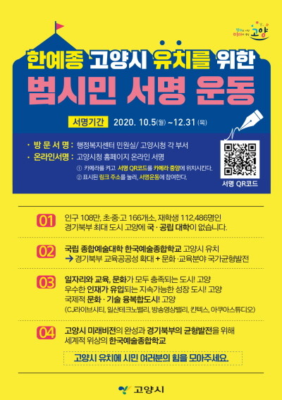 고양시 관계자는 “우수한 인재 유입은 물론 국제적 교육·문화 도시로 나아가는 시의 미래비전 실현을 위해 필요하다”며 “‘한예종 유치 범시민 서명운동’에 108만 시민 여러분이 힘을 모아 주길 바란다”고 당부했다.