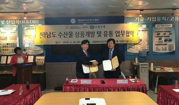 | ▲ 전남 완도읍에 위치한 해양바이오연구센터 홍보관에서 해양바이오연구센터와 ㈜수협유통이 전남수산물의 고부가가치 상품개발과 판로 확보로 기업지원과 지역 수산업 경제활성화에 공동으로 협력하기로 26일 MOU를 체결하고 기념사진을 촬영하고 있다. <사진제공=해양바이오연구센터> |