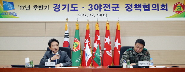 남경필 경기도지사와 김운용 제3야전군사령관은 19일 3야전군사령부 중회의실에서 열린 ‘2017년도 하반기 경기도-제3야전군사령부 정책협의회’에서 김포 민통선 이북 출입자 자동통제시스템 구축 등 안건 12건에 대한 협력방안을 모색했다.