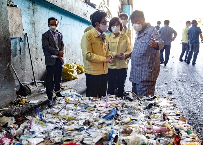 | ▲조명래(왼쪽) 환경부 장관이 21일 오후 서울 영등포구 자원순환센터를 방문해 재활용폐기물 분리·선별 현장을 점검하고, 관계자와 폐기물 처리 문제에 대해 이야기하고 있다. (사진=환경부 제공) |