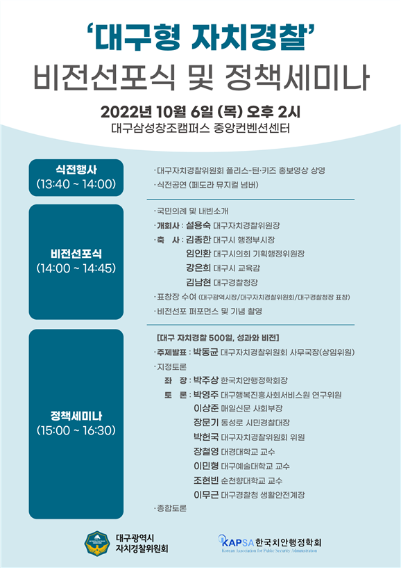 이번 행사는 자치경찰위원회 출범 500일을 맞아 ‘시민중심, 시민안전, 대구 자치경찰’이라는 대구시 자치경찰위원회의 비전을 알리고, 자치경찰의 발전방향을 모색하기 위해 마련됐다.