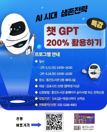 프로그램 운영 장소는 통진도서관 2층 세미나실이며, 신청 방법은 온라인(통진도서관 게시판) 또는 유선으로 5월 9일(금)부터 할 수 있다. 모집 인원은 중학생 이상부터 성인까지를 선착순 25명이다.