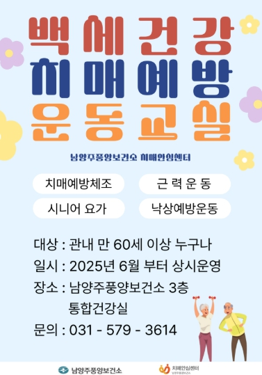 치매예방 운동교실 참여를 희망하는 주민은 남양주풍양보건소 치매안심센터에 전화 또는 방문해 신청할 수 있다.