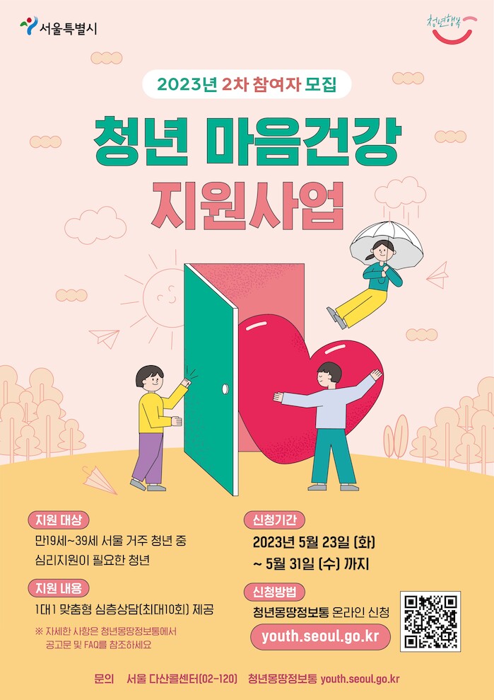 [세계로컬타임즈 이효진 기자] 서울시는 23일 10시부터 31일까지 ‘청년 마음건강 지원사업’ 참여자 3,000명을 2차 모집한다.