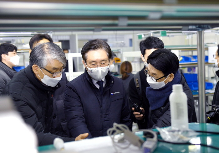 | ▲최종환 파주시장은 성윤모 산자부 장관과 함께 21일 국내 유일 인공호흡기 및 호흡치료기 전문 기업인 멕아이씨에스를 방문해 생산현장을 점검하고 직원들을 격려했다. (사진=파주시 제공) |
