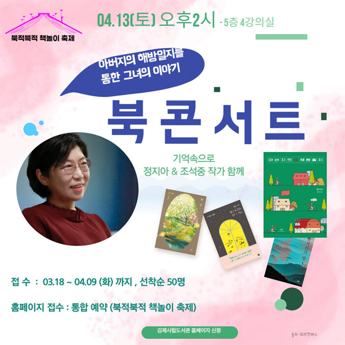 대표 행사로 1990년 첫 작품 ‘빨치산의 딸’로 등단, 2023년 만해문학상 수상작인 ‘아버지의 해방 일지’의 정지아 작가와 김제지역 조석중 작가가 이끄는 북콘서트와 인공지능 감성 로봇인 ‘리쿠와 함께하는 로봇댄싱 공연’등이 마련된다.