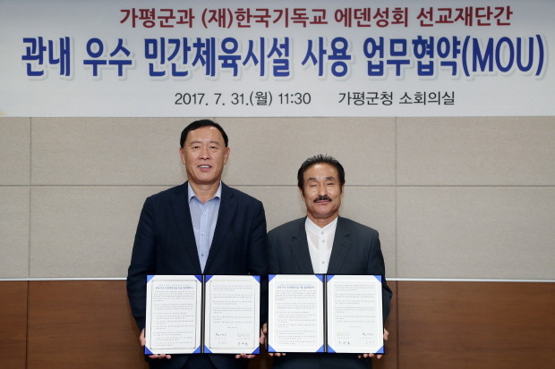 김 군수는 “오늘 협약체결을 위해 노력해 주신 에덴성회선교재단 관계자들에게 감사를 드린다”며 “향후 가평군이 스포츠 투어리즘의 메카로 성장할 수 있도록 지속적인 관심과 협조를 가져 달라”고 말했다.