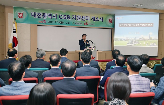 [세계로컬신문 오영균 기자] 대전시가 24일 한국생산성본부 대전충청지역본부에서 ‘대전광역시 기업의 사회적 책임(CSR) 지원센터’ 개소식을 열었다.