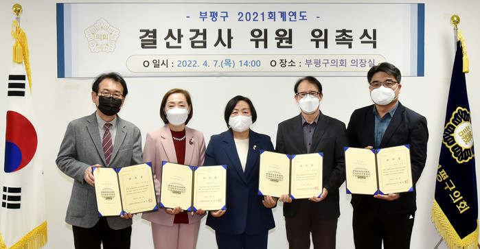 | ▲ 부평구의회가 '2021회계연도' 결산검사 위원을 위촉하고 결산검사 위원에 유정옥 의원(대표위원)과 권복성 세무사, 김천호 세무사, 이성노 세무사, 최규재 세무사 등 총 5명을 선임했다. 결산검사는 오는 4월 26일까지 진행되며 부평구의 세입·세출의 결산, 재무제표, 성과보고서, 결산서의 첨부서류, 금고의 결산 등을 검토한다. (사진=부평구의회) |
