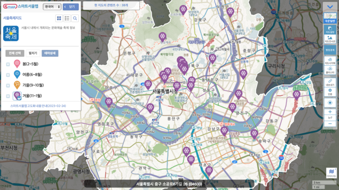 스마트서울맵 내 ‘서울축제지도’에서는 계절별로 축제를 구분해 서울 전역에서 개최되는 축제를 한눈에 볼 수 있으며 길찾기, 지도복사 등 편리한 기능을 활용할 수 있다.