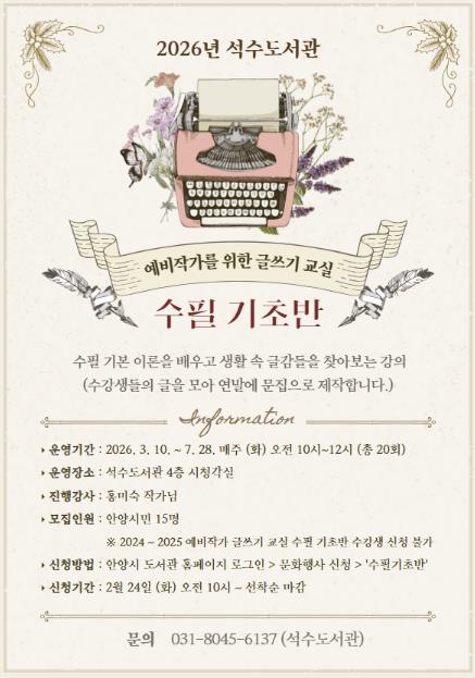 석수도서관 예비작가 글쓰기 교실 수업은 매년 수강생들의 입상 및 문인 등단의 꾸준한 성과를 내어 시민들의 자기 계발에 도움을 주고 있는 수업이다. 석수도서관 관계자는 글쓰기에 관심 있는 안양 시민들이 적극적인 참여로 자신의 재능을 발휘하는 기회가 되길 바란다고 밝혔다.