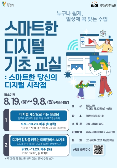 교육은 오는 9월 9일부터 11월 29일까지 광명시평생학습원에서 진행하며, 빠르게 변화하는 디지털 환경에 대응할 수 있도록 기획했다.