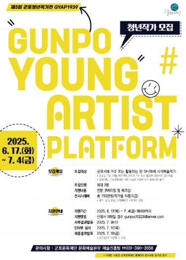 모집 대상은 군포시에 거주하거나 군포를 중심으로 활동하고 있는 만 19세 이상 39세 이하의 청년 시각예술작가이며, 군포문화재단 홈페이지에서 공고문을 확인한 후 이메일을 통해 지원하면 된다.