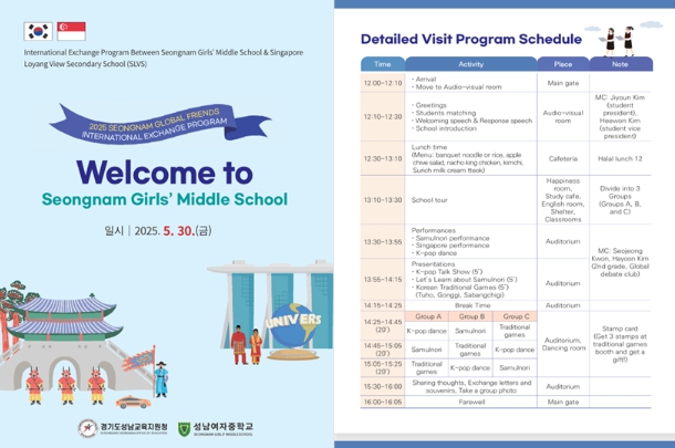 이번 행사에는 성남여중의 글로벌 디베이트 동아리(1~2학년)와 에코 영어 프레젠테이션 동아리(3학년) 소속 학생 24명이 참여하고, 싱가포르에서는 27명의 학생과 교사, 코디네이터 등 총 33명이 방문한다. 사물놀이 동아리 ‘지천’, 댄스 동아리 ‘제너러스’, 방송부 등 다양한 학교 동아리가 힘을 모아 이번 교류의 완성도를 높이고 있다.