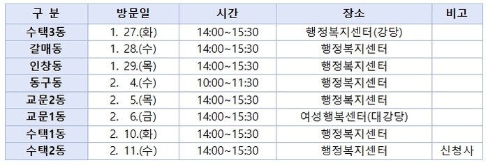 행사는 1월 27일부터 2월 11일까지 약 3주간 8개 동을 순차적으로 방문해 진행된다. 첫 일정은 1월 27일 수택3동에서 시작되며, 마지막 일정은 2월 11일 수택2동 신청사에서 마무리될 예정이다.