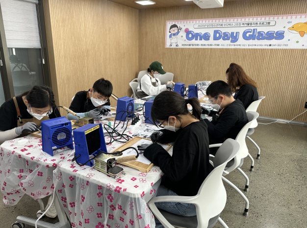 당진시 관내 청소년을 위해 다양한 시설을 제공하고 프로그램을 진행하고 있는 당진청소년카페 수다벅스 2호점은 당진시 청소년의 취미와 여가 활동을 지원하기 위해 스테인드글라스를 체험할 수 있는 [One Day Glass] 프로그램을 진행했다. 여가활동지원 프로그램인 [One Day Glass]는 기본적인 유리 공예 교육과 유리 공예사 직업에 대해 알아보는 시간을 가졌으며 스테인드글라스 썬캐쳐를 만들어보며 여가 활동에 있어 청소년의 건강한 여가문화를 형성하고 여가 활동을 통한 자기 계발의 방법을 배울 수 있는 프로그램이다.