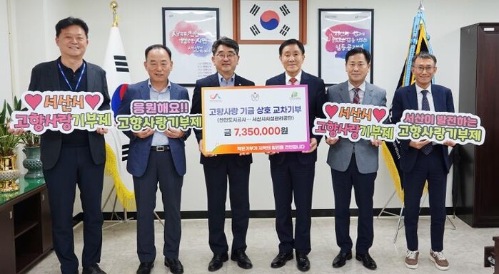 김성호 서산시시설관리공단 이사장은 “고향사랑기부제는 지역과 공공기관이 함께 성장할 수 있는 제도”라며 “이번 기탁을 통해 지역사회 발전에 힘을 보탤 수 있어 기쁘게 생각하며, 앞으로도 천안도시공사와 긴밀히 협력해 지역 상생발전에 적극 동참하겠다”라고 말했다.