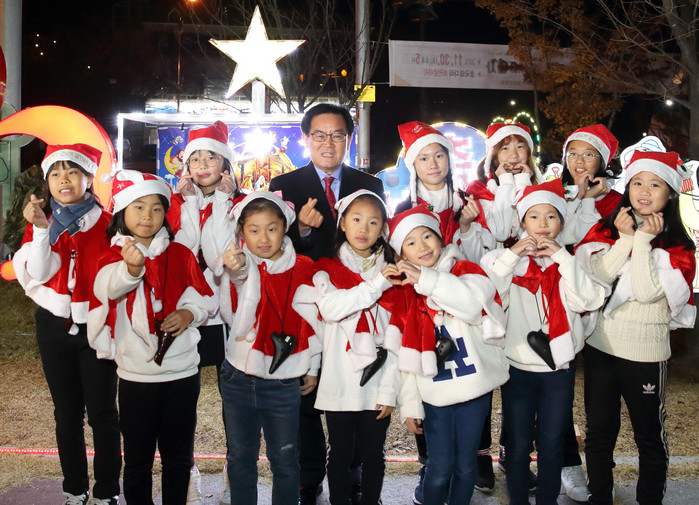 | ▲백선기 칠곡군수는 점등식을 마치고 어린이들과 기념촬영을 하고 있다(사진=칠곡군) |