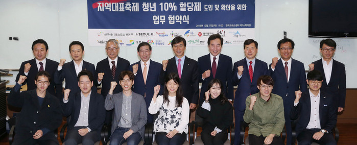 | ▲ 원희룡 제주도지사, 남경필 경기도지사, 김영만 서울신문 사장, 박원순 서울시장, 안희정 충남도지사, 이낙연 전남도지사, 김승수 대구부시장, 박병호 광주광역시 부시장, 이광재 한국매니페스토실천본부 사무총장(뒷줄 왼쪽부터)이 27일 오전 서울시 중구 한국프레스센터에서 열린 '지역대표축제 청년 10% 할당제 도입 및 확산을 위한 업무협약‘을 체결한 뒤 파이팅을 외치며 기념촬영하고 있다.<사진제공=전남도청> |