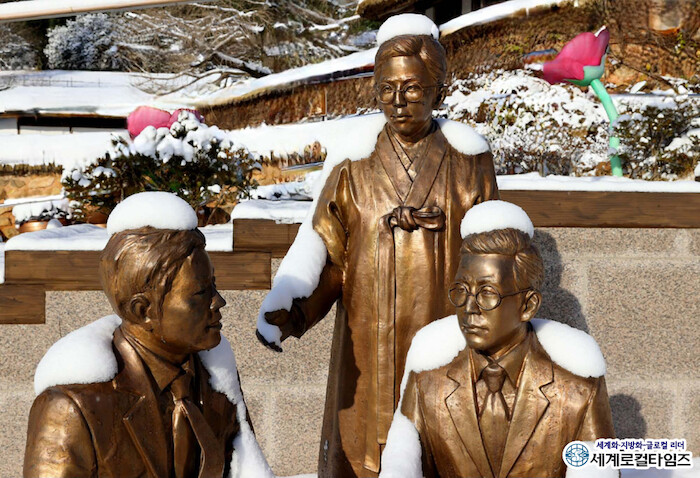 [세계로컬타임즈 글·사진 이남규 기자] 17일 오전, 전남 강진의 시문학파기념관 앞에 세워진 3인의 시인 동상이 밤새 내린 눈으로 흰 모자를 쓰고 있는 듯 하다. 김윤식는 ‘모란이 피기까지’, 정지용은 ‘향수’, 박용철은 ‘떠나가는 배’로 1930년대 순수시 운동을 전개하며 문학 동인회를 주도했다.