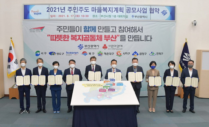 부산시는 지역의 복지문제를 주민이 주도하는 마을복지계획공동모금회 협력사업으로 전국 최초로 추진하는 이 사업의 원활한 사업추진을 위해 이날 오전 시청 1층 대회의실에서 부산사회복지공동모금회와 사업에 참여하는 8개구가 함께 '2021년 주민주도 마을복지계획 공모사업 업무협약'을 체결했다.