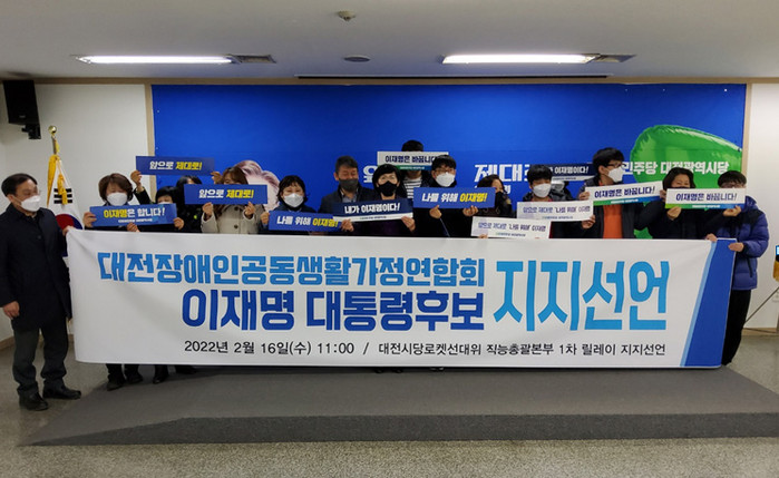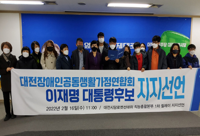 [세계로컬타임즈 민순혜 기자] ‘수요자가 선택하고 결정하는, 이용자 중심의 복지국가 건설’을 위해 대전 장애인 공동생활가정 연합회가 16일 이재명 더불어민주당 대통령후보 지지를 선언했다.