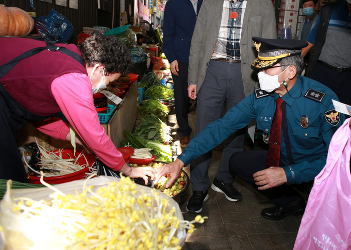 | ▲윤동춘 경북지방경찰청장이 추석을 앞두고 종합치안활동 점검 차 영주시 상설시장을 방문해 제수용품을 구입하고 있다.(사진=경북경찰 제공 |