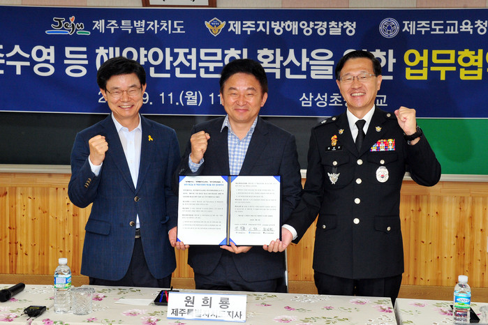 원희룡 제주도지사와 이석문 제주도교육감, 윤성현 제주지방해양경찰청장은 11일 오전 제주 삼성초등학교(제주시 서광로 위치) 4층 다목적실에서 ‘생존수영교실 등 해양안전문화 확산을 위한 업무협약’을 체결했다.