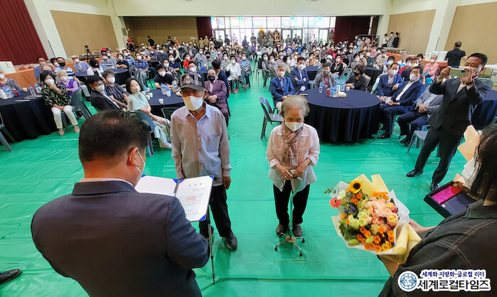 | ▲27일 김제시에서 경로 효 잔치가 열린 가운데 장수상을 전달하고 있다. |