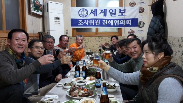 [세계로컬신문 김세완 조사위원] 세계일보 조사위원 진해협의회(회장 김세완)가 지난달 29일 진해 한 식당에서 신년회를 갖고 건배제의 및 기념사진 촬영을 하고 있다.