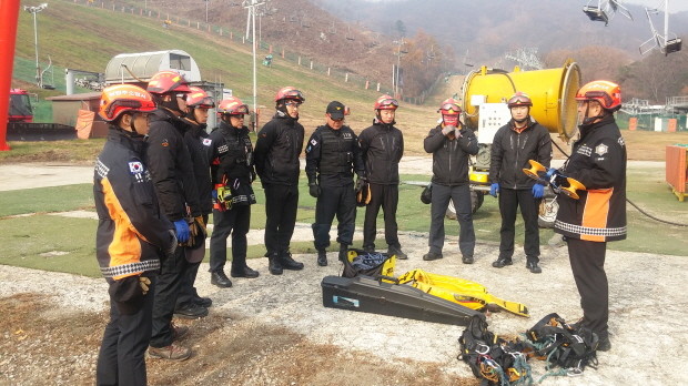 | ▲ 13일 남양주시 스타힐리조트 스키장에서 남양주소방서 구조대원이 리프트 사고 대응훈련을 실시하고 있다. <사진제공=남양주소방서> |