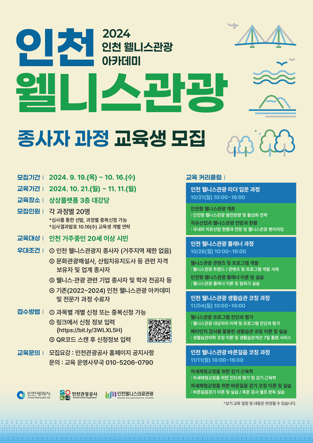 [세계로컬타임즈 = 김병민 기자] 인천광역시와 인천관광공사는 인천 웰니스관광 전문 인력 양성을 위해 오는 10월 21일(월)부터 11월 11일(월) 까지 매주 월요일, 총 4회에 걸쳐 ‘2024 인천 웰니스관광지 종사자 교육’을 운영한다고 밝혔다.