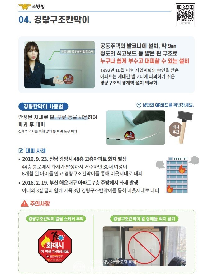 김형섭 예방안전과장은 “경량칸막이의 용도를 바로 알고 있어야 유사시 이 벽체를 통해 대피할 수 있다”라며 “평소 경량칸막이에 대해 관심을 둘 것”을 당부했다.