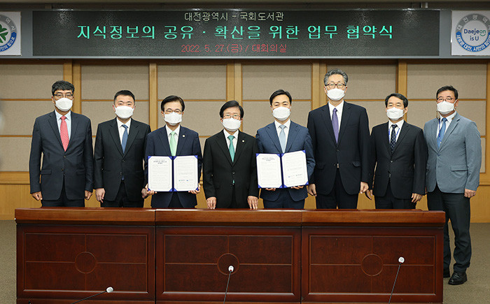 대전시와 국회도서관은 지식정보의 공유 ㆍ 확산을 위해 △디지털 도서관 구축 △국회전자도서관 원문 데이터베이스 이용 확대와 협력 △디지털 정보자원의 상호 공유 및 활용 등을 위해 긴밀하게 협력하기로 했다. 이와 함께 전문분야 학술행사 및 문화예술 행사·전시 등을 공동 추진하기로 했다.