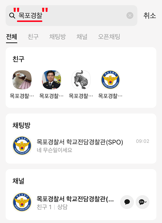 카카오톡 채널에서 ‘목포경찰’을 검색해 채널을 추가하면 목포경찰서 학교전담경찰관(SPO)과 1:1 실시간 상담을 할 수 있다.