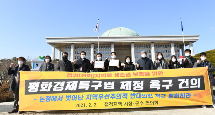 이에 접경지역시장군수협의회는 “접경지역은 휴전 이후 70여 년 동안 대한민국의 존립을 위한 군사·안보의 요충지로 각종 규제와 제한을 받아온 결과 지역은 낙후됐고 접경지역 주민들은 각종 기본권·재산권 등을 침해받아 지역경제는 악화됐다”며 “낙후된 접경지역에 평화경제특별구역이 지정될 경우, 남북의 활발한 경제 교류를 통해 새로운 성장동력이 될 것으로 접경지역 주민의 간절한 염원을 담아 평화경제특구법률안의 조속한 제정을 촉구한다”는 내용의 건의문을 국회 외교통일위원회 법안심사소위원회에 전달했다.