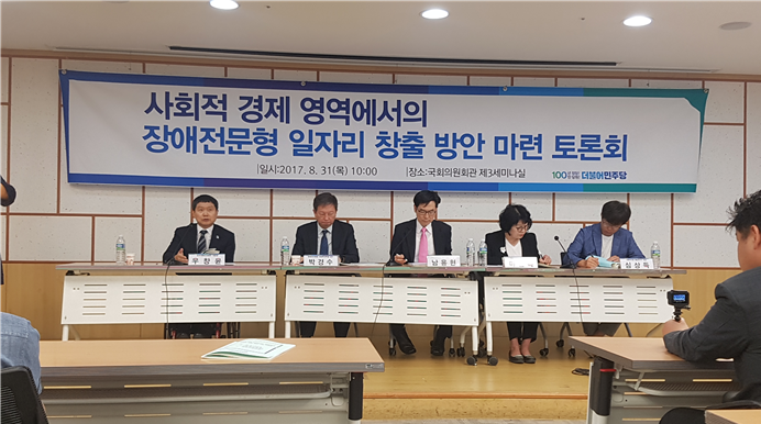 | ▲ 우창윤 서울시의원(사진 맨 왼쪽)이 지난달 31일 '사회적 경제 영역에서의 장애전문형 일자리 창출 방안 마련 토론회'를 개최하고 있다. <사진제공=서울시의회> |