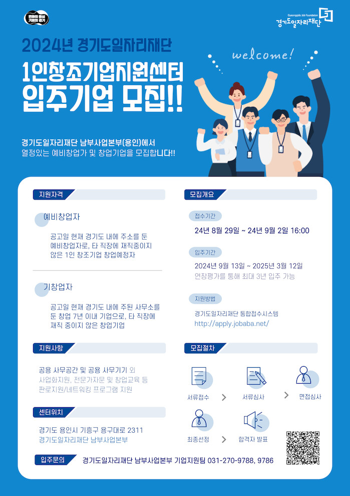 접수기간은 8월 29일에서 9월 2일 오후 4시까지이며, 공고일 기준(2024년 8월 2일) 경기도에 주소를 둔 1인 창조기업 예비 창업자 또는 경기도 내주 사무소를 둔 창업 7년 이내의 1인 창조기업 창업자라면 신청할 수 있다.