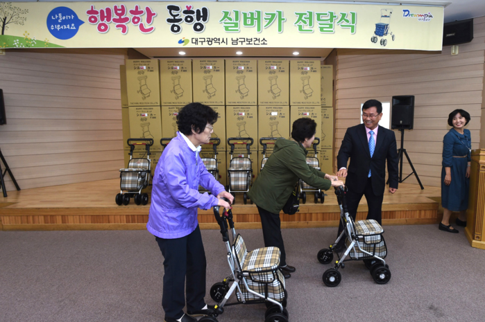 20일 대구시 남구에 따르면 (주)테크엔(회장 이영섭)이 19일 저소득층 어르신을 위해 앉아 쉴 수 있고 무거운 짐도 담을 수 있는 활동보조장비인 일명 실버카 100대를 남구보건소에 전달했다.