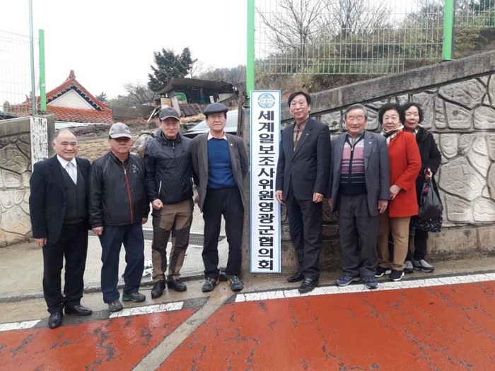 | ▲ 전남 영광군 영광읍 백학리에 마련된 세계일보 조사위원 영광군협의회 사무실 앞에서 현판식을 하고 기념촬영을 하고 있는 모습 |