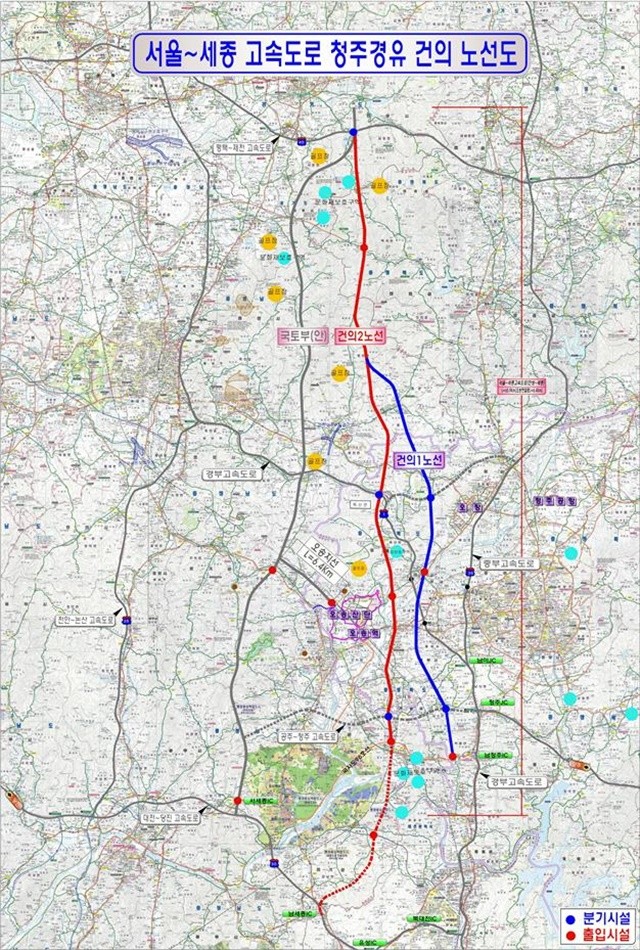 | ▲ 충북도와 청주시가 국토부에 건의할 '세종~서울 고속도로' 청주 경유노선 2개안.<사진제공=충북도청> |