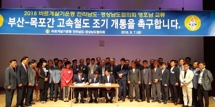| ▲ 바르게살기운동 교류행사에서 전남 경남 시·군 회장단의 부산-목포간 고속철도 개통을 촉구하는 서명식이 진행되고 있다. |