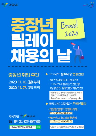 또한 ‘Bravo! 중장년 릴레이 채용의 날’ 기간 고양시통합일자리센터 블로그에서는 중장년 맞춤형 온라인 특강도 시리즈로 운영한다.