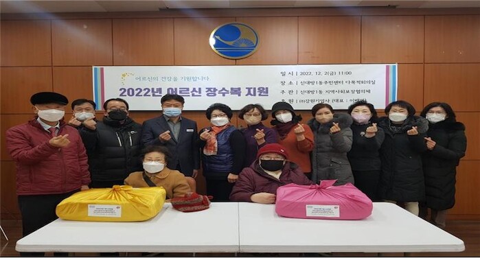 8일 서울 동작구에 따르면 신대방1동에서는 ㈜강원기업사(대표 이배연) 후원으로 매년 생활이 어려운 어르신에게 장수복을 지원해 이들의 만수무강을 기원해오고 있다.